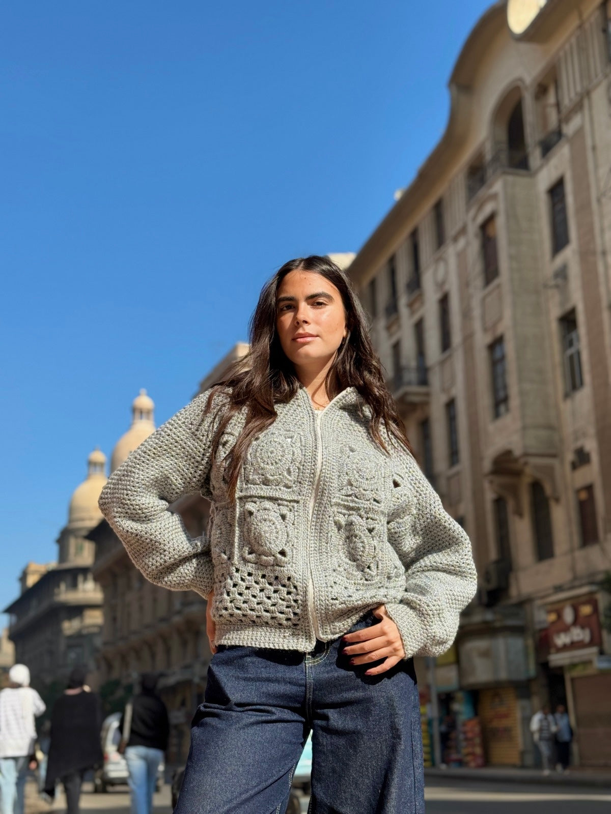 A statement crochet jacket that blends texture, warmth, and modern edge. Handcrafted with intricate stitch detailing and a structured silhouette, this piece features a front zip closure and subtly voluminous sleeves for a bold yet wearable look.